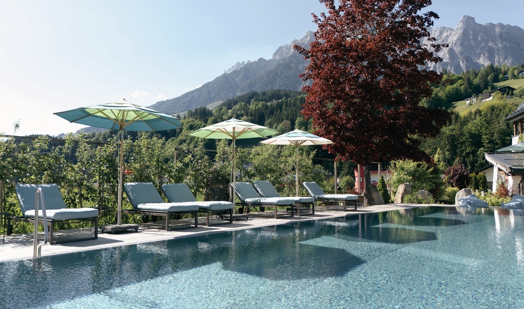 Hotel-Der-Loewe-Aussenpool-im-Sommer_Hotel-Der-Loewe- Die Sommersaison 2025 verläuft für die Betriebe im Alpenraum bislang erfolgreich. © Hotel "Der Löwe"
