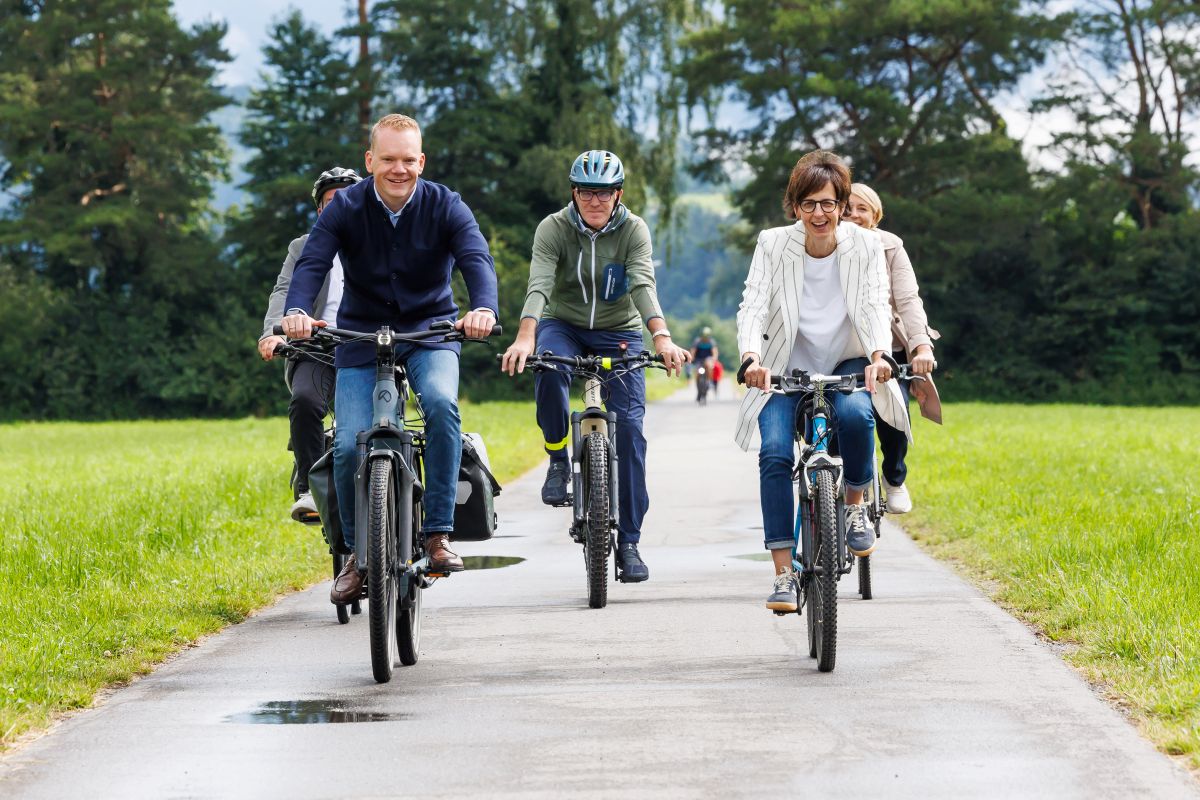 Die EuroVelo 15 führt nun auch durch Vorarlberg. Regierungsrätin Susanne Hartmann, Bau- und Umweltdepartement des Kantons St.Gallen (CH), Landesstatthalter Christof Bitschi, Landesrat für Mobilität, Land Vorarlberg (vorne) testen einen Abschnitt. © Land Vorarlberg/Bernd Hofmeister