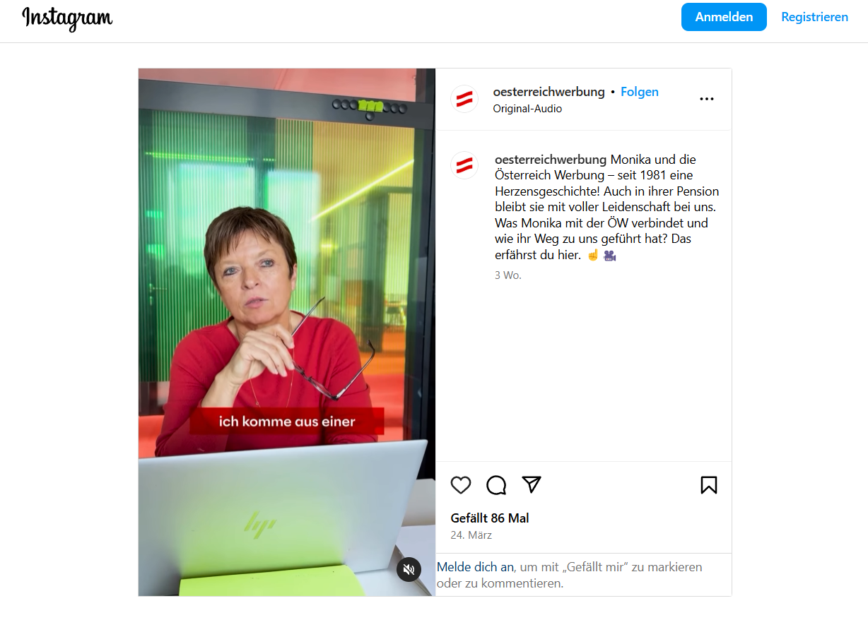 Hey Monika! ist ein neues Instagram-Format der Österreich Werbung. Darin erklärt die langjährige Mitarbeiterin Monika Plank, wie das so funktioniert, mit der Werbung für Österreich. © Screenshot