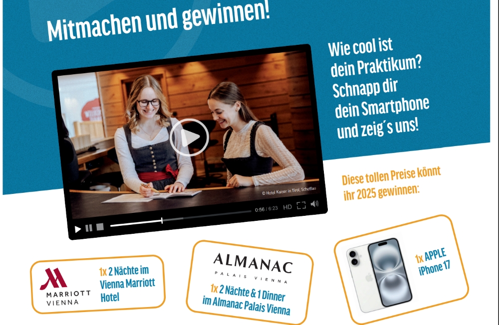 ÖHV Videowettbewerb #bestpraktikum Die ÖHV lädt Tourismus-Schülerinnen und -schüler zum Videowettbewerb #bestpraktikum ein. © ÖHV/TN-Austria